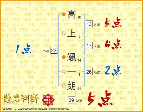 高上颯一朗さんの総運は39画の5点!