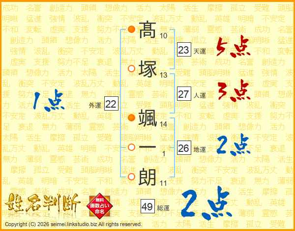 髙(10画)塚(13画) 颯(14画)一(1画)朗(11画)