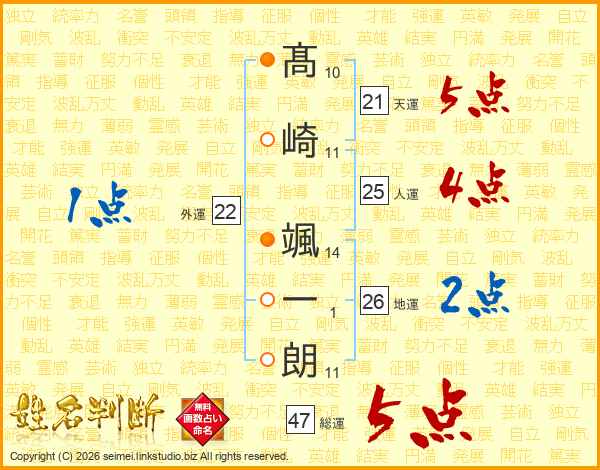 髙(10画)崎(11画) 颯(14画)一(1画)朗(11画)