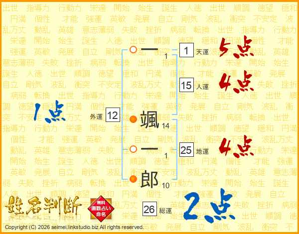 生活面を象徴する運勢です。外部から受ける影響力を表し、結婚運、家庭運や職場、環境への順応性を表します。総運から人運を引いた画数。姓や名が1文字の場合を除く。