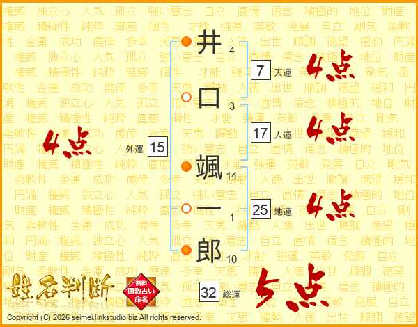井(4画)口(3画) 颯(14画)一(1画)郎(10画)