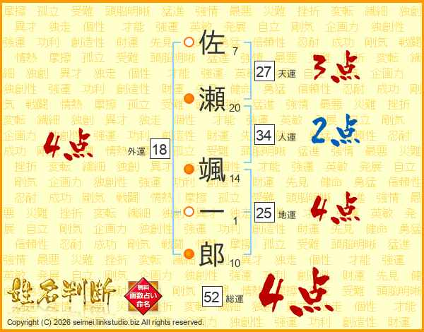 佐(7画)瀬(20画) 颯(14画)一(1画)郎(10画)