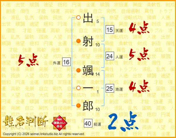 出(5画)射(10画) 颯(14画)一(1画)郎(10画)