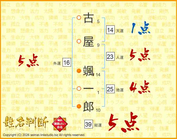 古(5画)屋(9画) 颯(14画)一(1画)郎(10画)