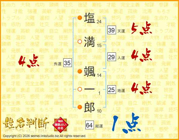 塩(24画)満(15画) 颯(14画)一(1画)郎(10画)