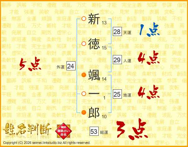 新(13画)徳(15画) 颯(14画)一(1画)郎(10画)