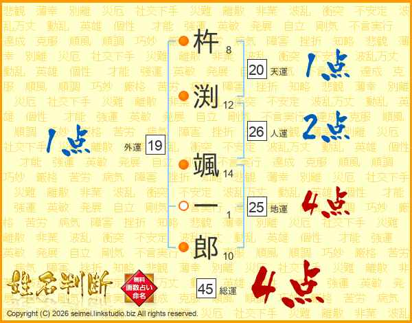 杵(8画)渕(12画) 颯(14画)一(1画)郎(10画)