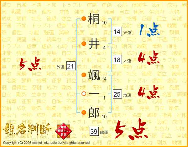 桐井颯一郎さんの総運は39画の5点!