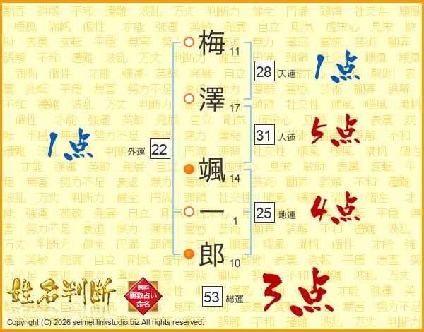 梅(11画)澤(17画) 颯(14画)一(1画)郎(10画)
