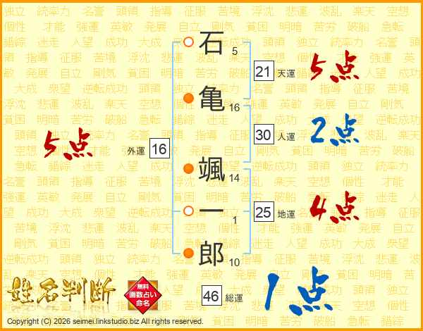 石亀颯一郎さんの天運は21画の5点!