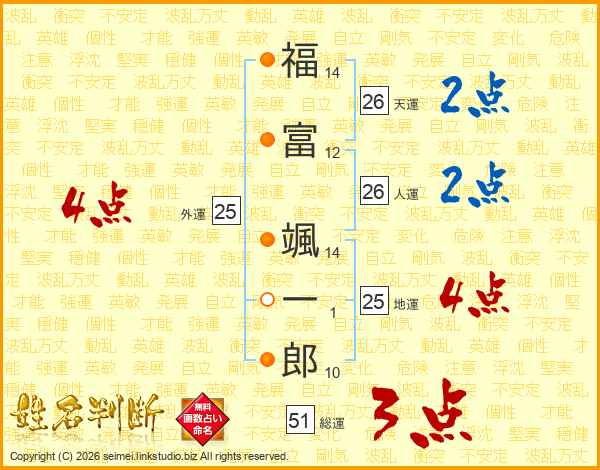 福(14画)富(12画) 颯(14画)一(1画)郎(10画)