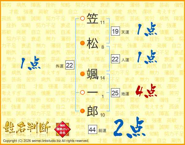 笠(11画)松(8画) 颯(14画)一(1画)郎(10画)