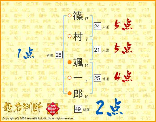 篠(17画)村(7画) 颯(14画)一(1画)郎(10画)