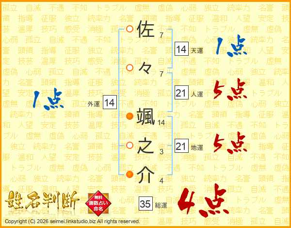 佐(7画)々(7画) 颯(14画)之(3画)介(4画)
