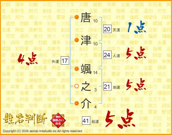 唐津颯之介さんの総運は41画の5点!
