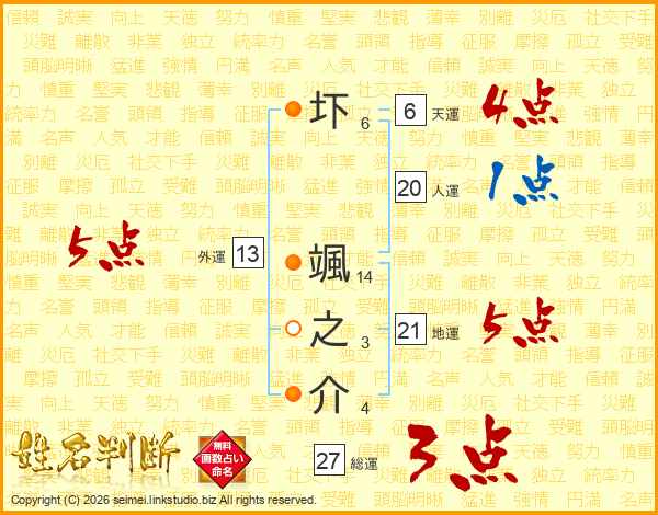 生活面を象徴する運勢です。外部から受ける影響力を表し、結婚運、家庭運や職場、環境への順応性を表します。総運から人運を引いた画数。姓や名が1文字の場合を除く。
