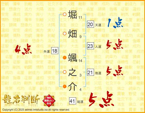 堀(11画)畑(9画) 颯(14画)之(3画)介(4画)
