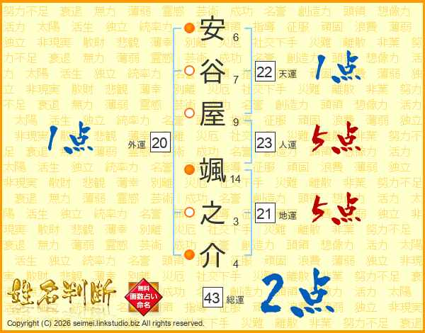 安(6画)谷(7画)屋(9画) 颯(14画)之(3画)介(4画)