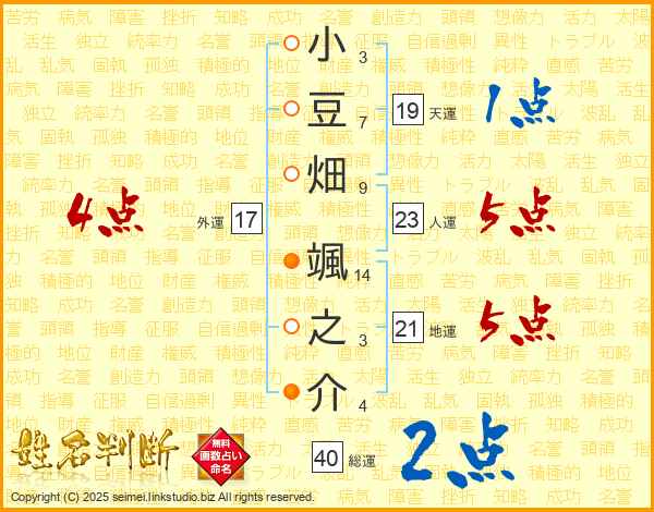 小(3画)豆(7画)畑(9画) 颯(14画)之(3画)介(4画)
