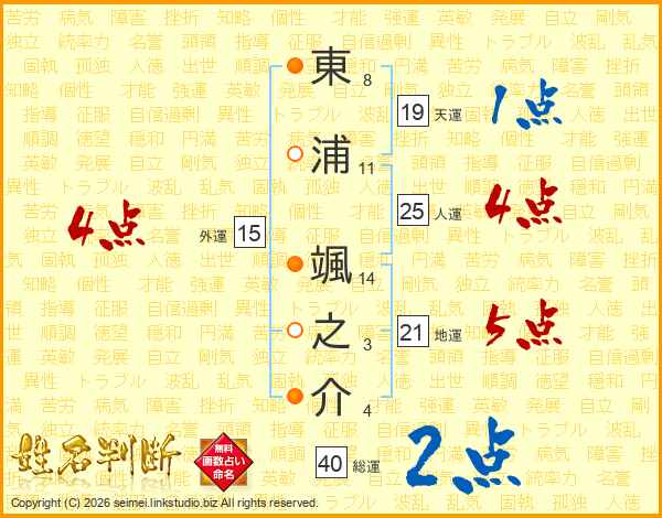 東(8画)浦(11画) 颯(14画)之(3画)介(4画)