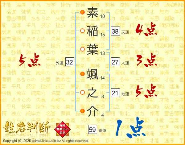 素(10画)稲(15画)葉(13画) 颯(14画)之(3画)介(4画)