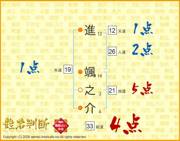 生活面を象徴する運勢です。外部から受ける影響力を表し、結婚運、家庭運や職場、環境への順応性を表します。総運から人運を引いた画数。姓や名が1文字の場合を除く。