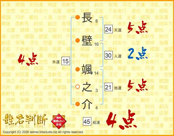 長(8画)壁(16画) 颯(14画)之(3画)介(4画)