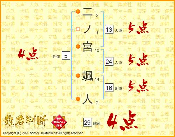 生活面を象徴する運勢です。外部から受ける影響力を表し、結婚運、家庭運や職場、環境への順応性を表します。総運から人運を引いた画数。姓や名が1文字の場合を除く。