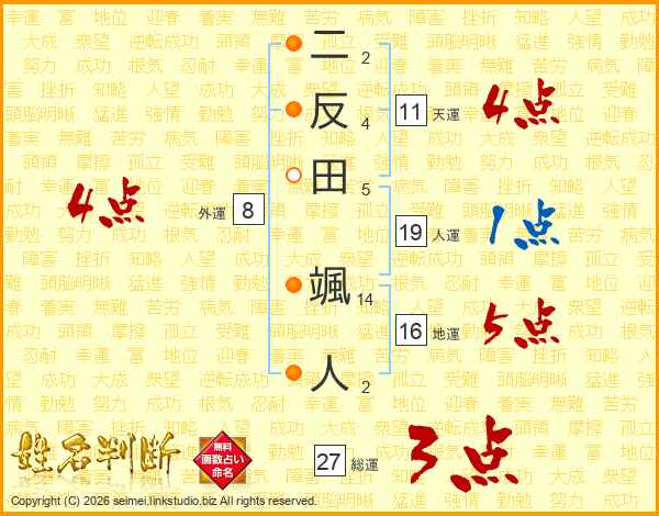 生活面を象徴する運勢です。外部から受ける影響力を表し、結婚運、家庭運や職場、環境への順応性を表します。総運から人運を引いた画数。姓や名が1文字の場合を除く。