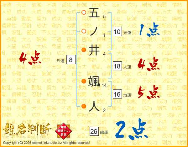 生活面を象徴する運勢です。外部から受ける影響力を表し、結婚運、家庭運や職場、環境への順応性を表します。総運から人運を引いた画数。姓や名が1文字の場合を除く。