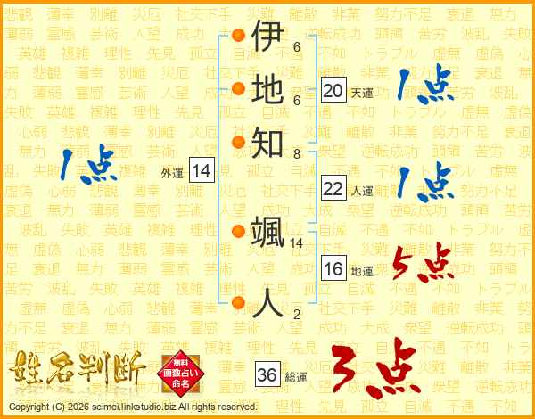 伊(6画)地(6画)知(8画) 颯(14画)人(2画)