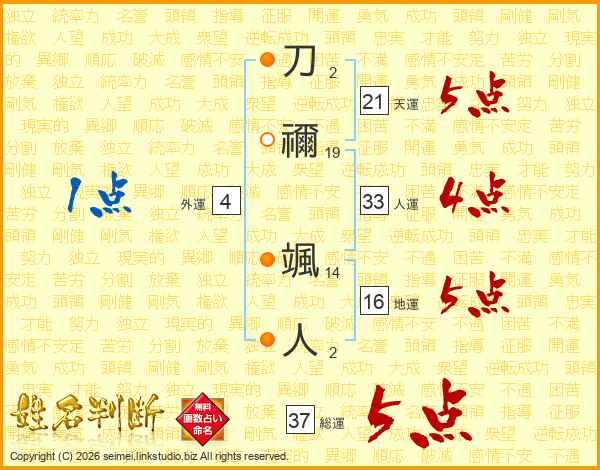 刀禰颯人さんの総運は37画の5点!
