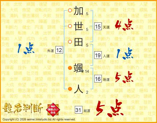 加(5画)世(5画)田(5画) 颯(14画)人(2画)