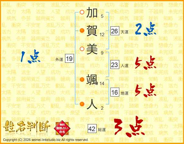 加(5画)賀(12画)美(9画) 颯(14画)人(2画)