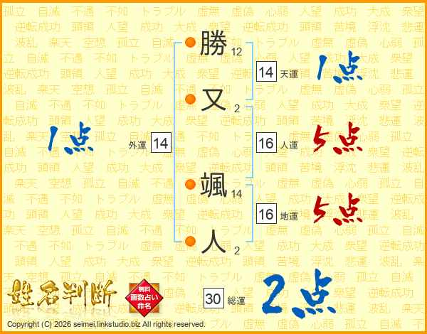 生活面を象徴する運勢です。外部から受ける影響力を表し、結婚運、家庭運や職場、環境への順応性を表します。総運から人運を引いた画数。姓や名が1文字の場合を除く。