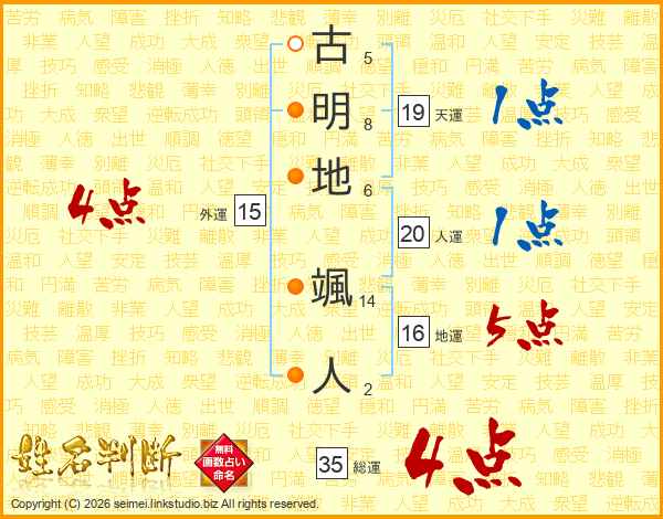 古(5画)明(8画)地(6画) 颯(14画)人(2画)