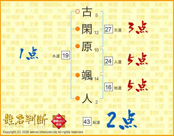 古(5画)閑(12画)原(10画) 颯(14画)人(2画)