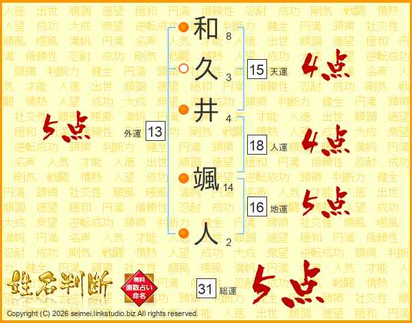 和(8画)久(3画)井(4画) 颯(14画)人(2画)