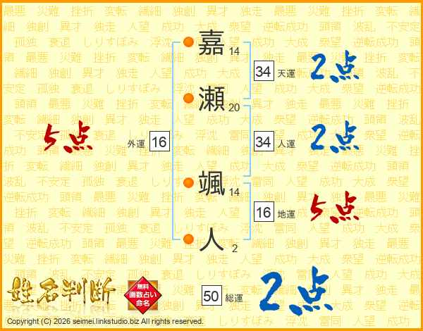 嘉(14画)瀬(20画) 颯(14画)人(2画)