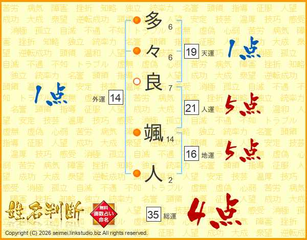多(6画)々(6画)良(7画) 颯(14画)人(2画)