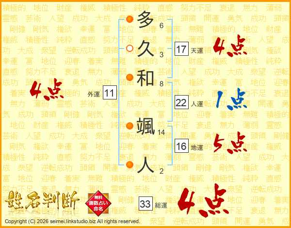 多久和颯人さんの総運は33画の4点!
