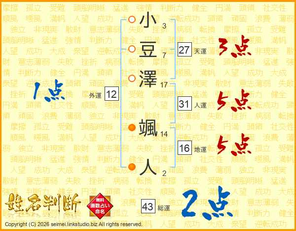 小(3画)豆(7画)澤(17画) 颯(14画)人(2画)