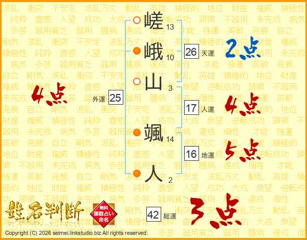 生活面を象徴する運勢です。外部から受ける影響力を表し、結婚運、家庭運や職場、環境への順応性を表します。総運から人運を引いた画数。姓や名が1文字の場合を除く。