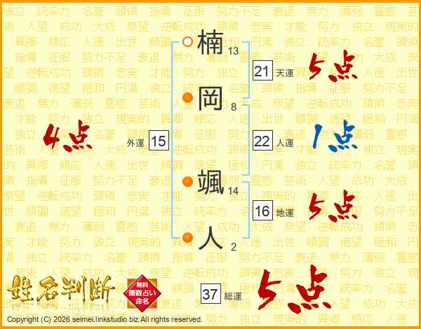 楠(13画)岡(8画) 颯(14画)人(2画)