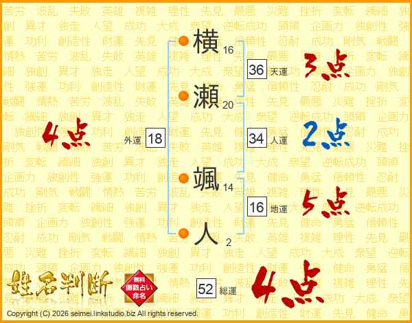 横瀬颯人さんの総運は52画の4点!