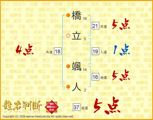 あなたの人生を表す1番重要な運勢です。生涯を通じて影響する総合運となり、主に50歳以降の晩年期に影響を及ぼします。苗字と名前の合計画数。