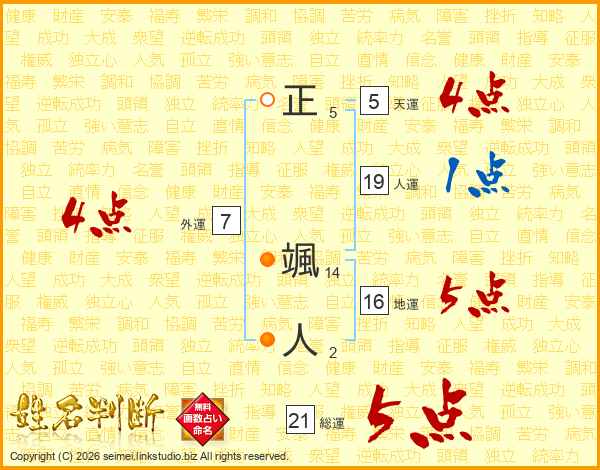 生活面を象徴する運勢です。外部から受ける影響力を表し、結婚運、家庭運や職場、環境への順応性を表します。総運から人運を引いた画数。姓や名が1文字の場合を除く。