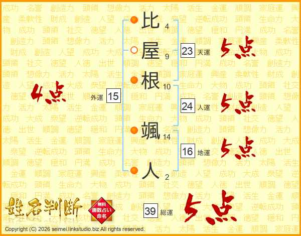 比(4画)屋(9画)根(10画) 颯(14画)人(2画)