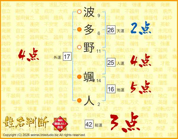生活面を象徴する運勢です。外部から受ける影響力を表し、結婚運、家庭運や職場、環境への順応性を表します。総運から人運を引いた画数。姓や名が1文字の場合を除く。