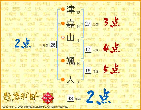 津(10画)嘉(14画)山(3画) 颯(14画)人(2画)